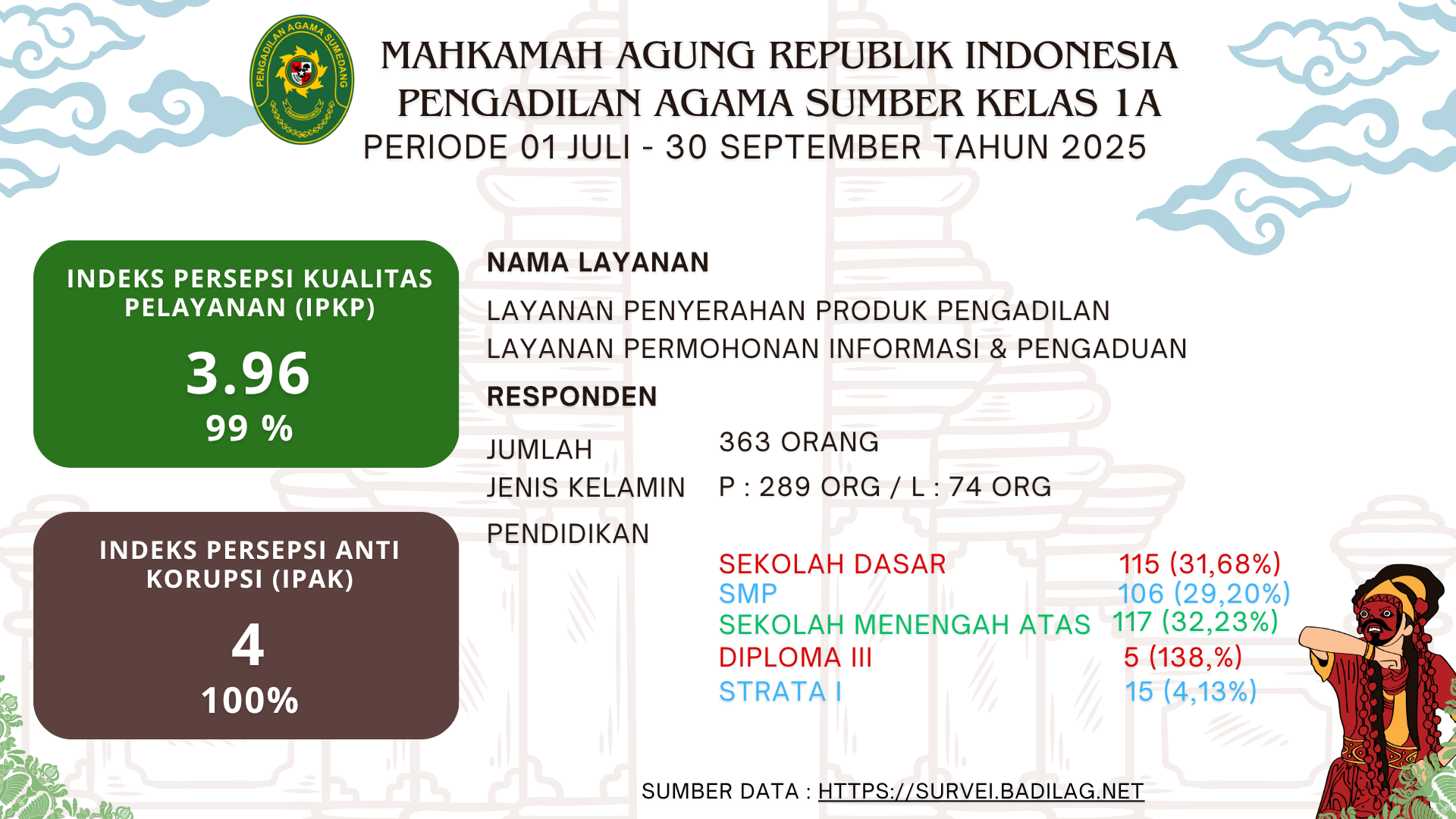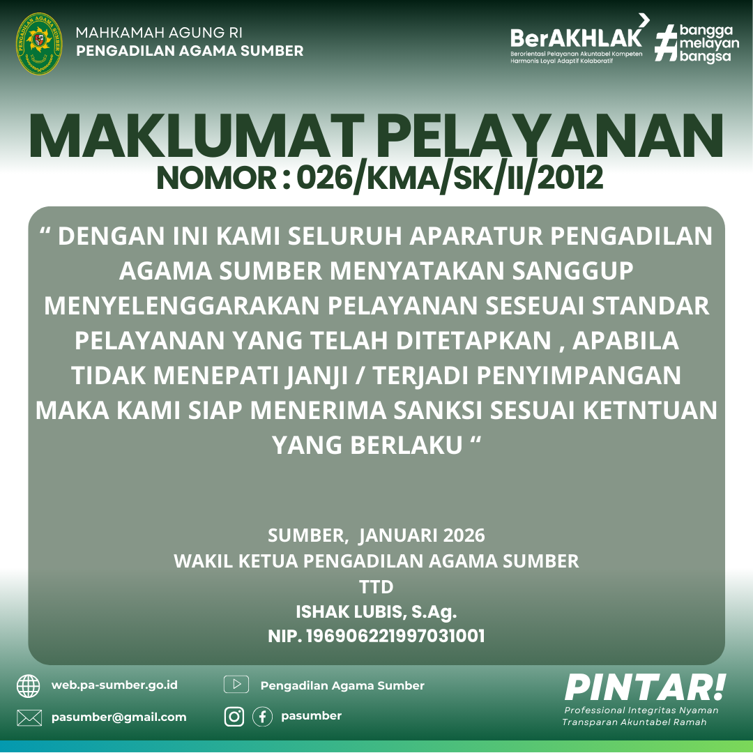 Pengadilan Agama Sumber melaksanakan kegiatan Penandatanganan Pakta Integritas, Perjanjian Kinerja, dan Komitmen Bersama dalam rangka mewujudkan Zona Integritas menuju Wilayah Birokrasi Bersih dan Melayani (WBBM) pada hari Jum’at, 02 Januari 2026. Kegiatan ini...