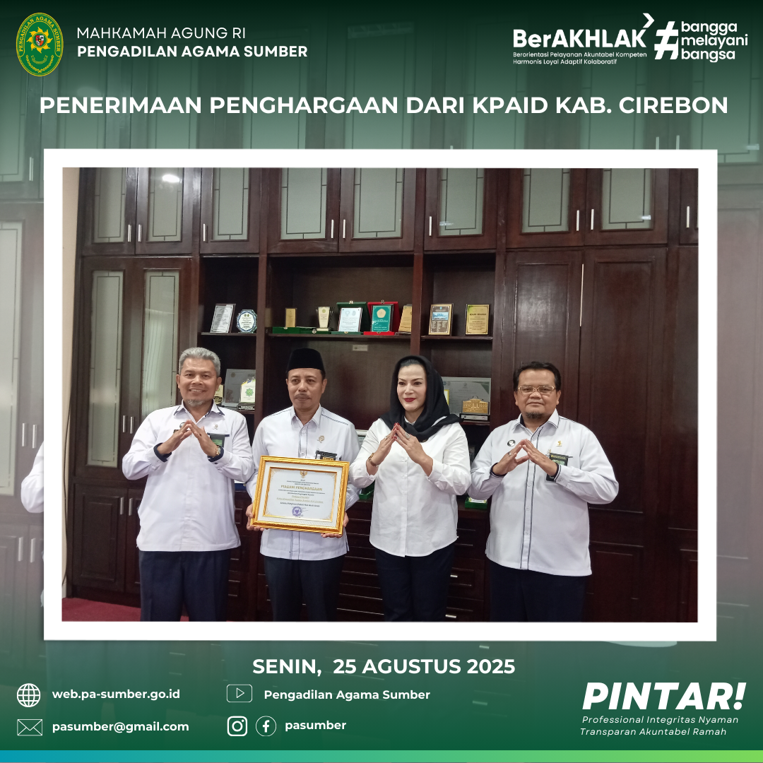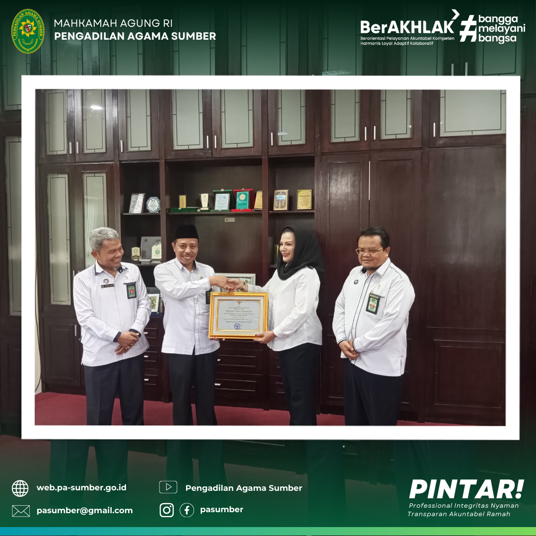 Bertempat di Ruang Ketua Pengadilan Agama Sumber menerima Kunjungan dari Komisi Perlindungan Anak Indonesia Daerah (KPAID) Kabupaten Cirebon. Dalam kesempatan ini juga Hj. Fifi Sofiah selaku Ketua KPAID Kabupaten Cirebon memberikan penghargaan kepada Ketua Pengadilan Agama Sumber YM.Bpk. Firdaus, S.Ag., M.H. selaku Pimpinan Peduli Hak Asuh Anak.