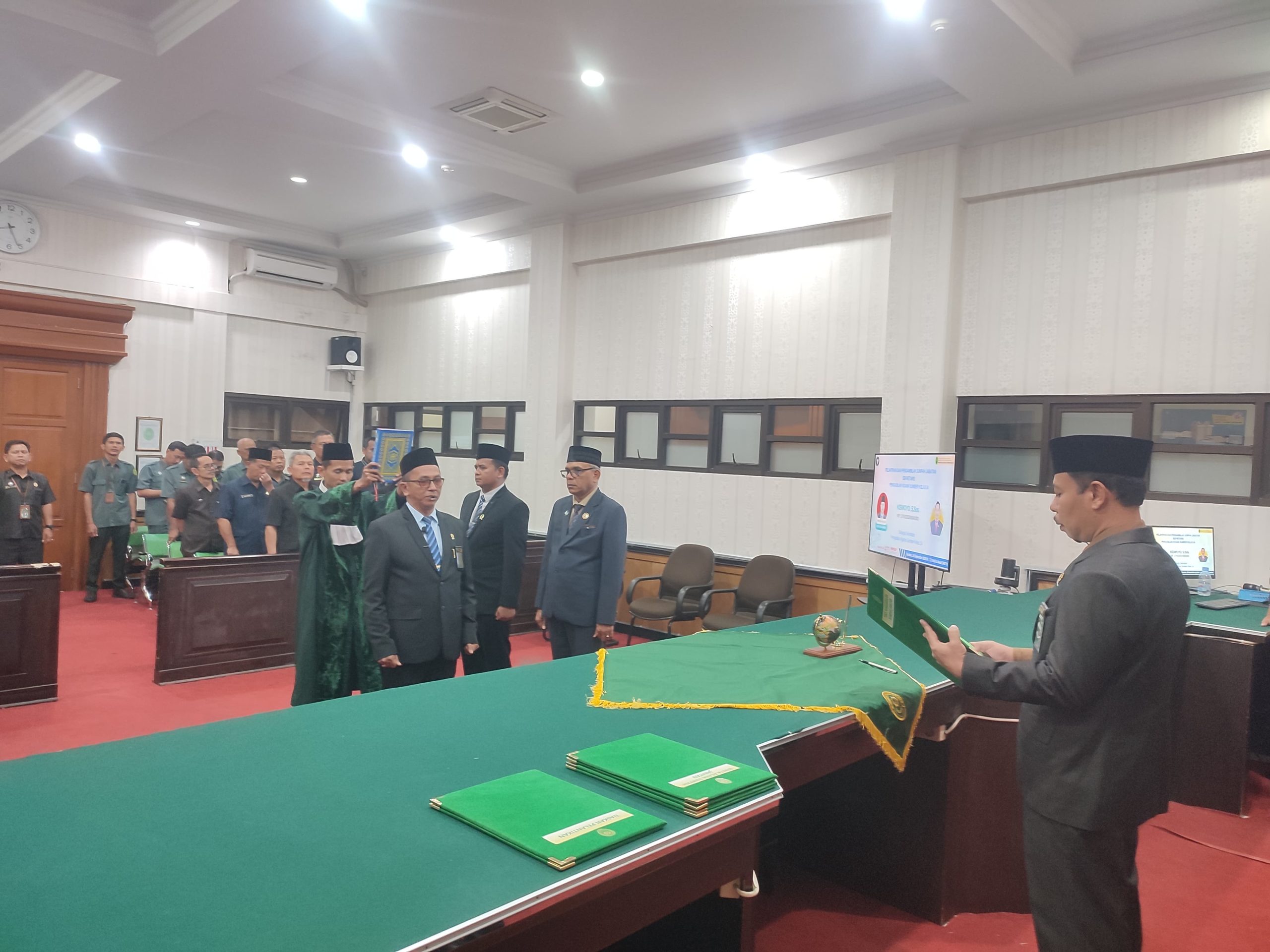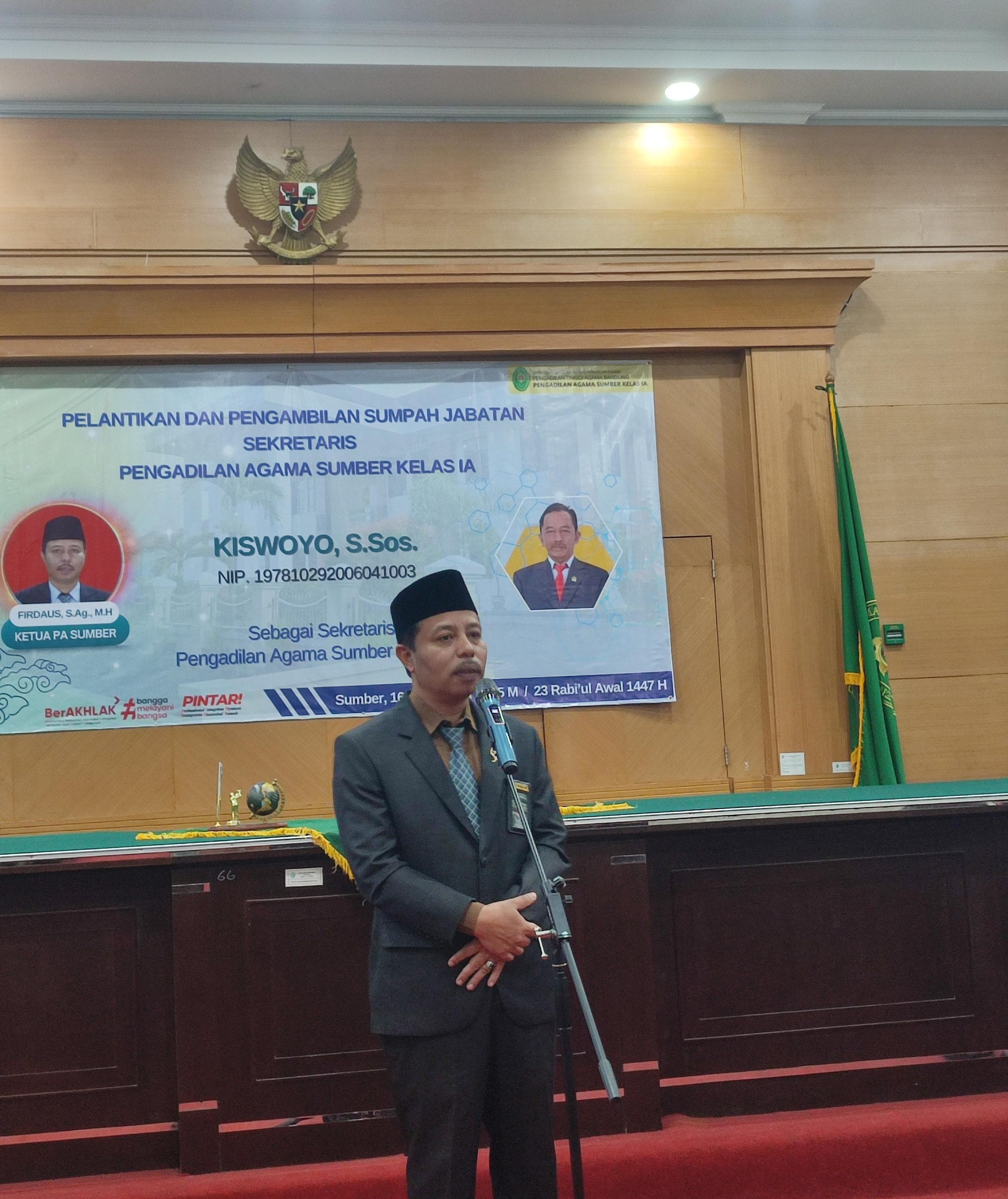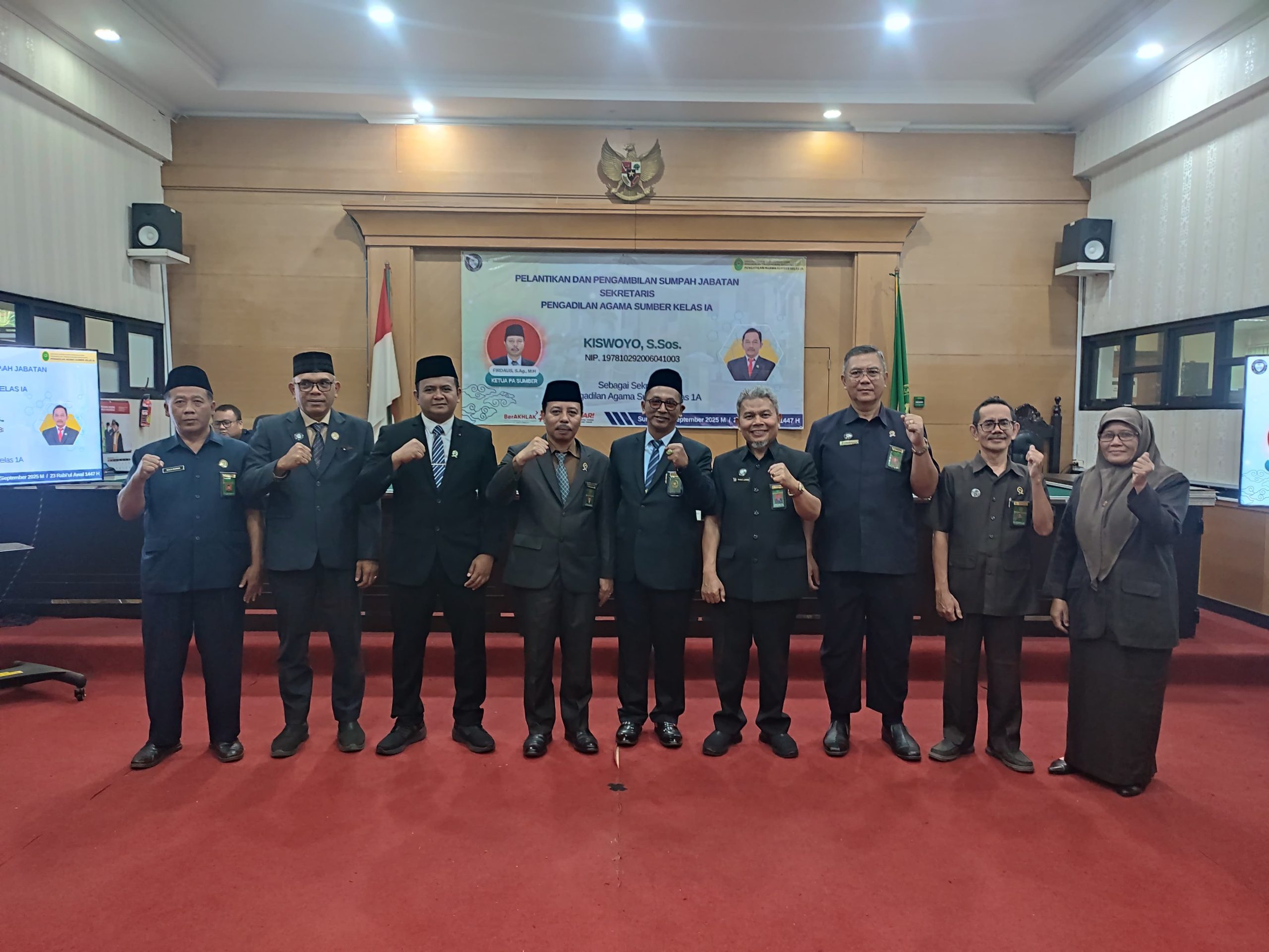 Sumber, 16 September 2025 – Bertempat di Ruang Sidang Uama Pengadilan Agama Sumber, Ketua Pengadilan Agama SUmber, Firdaus, S. Ag., M.H. Melantik sekretaris Pengadilan Agama Sumber yang baru yaitu Kiswoyo, S. Sos yang sebelumnya bertugas di Pengadilan Negeri Tarakan.
