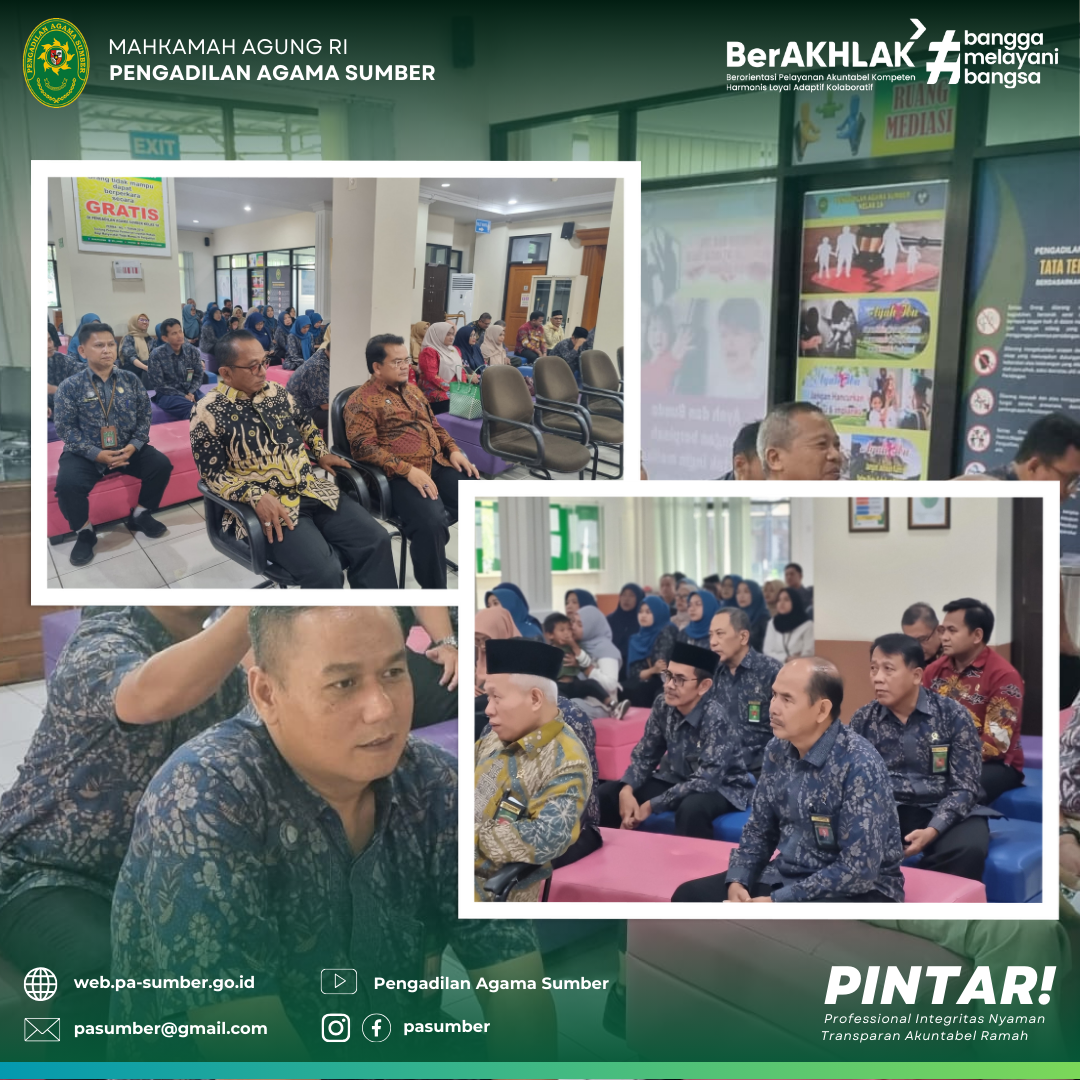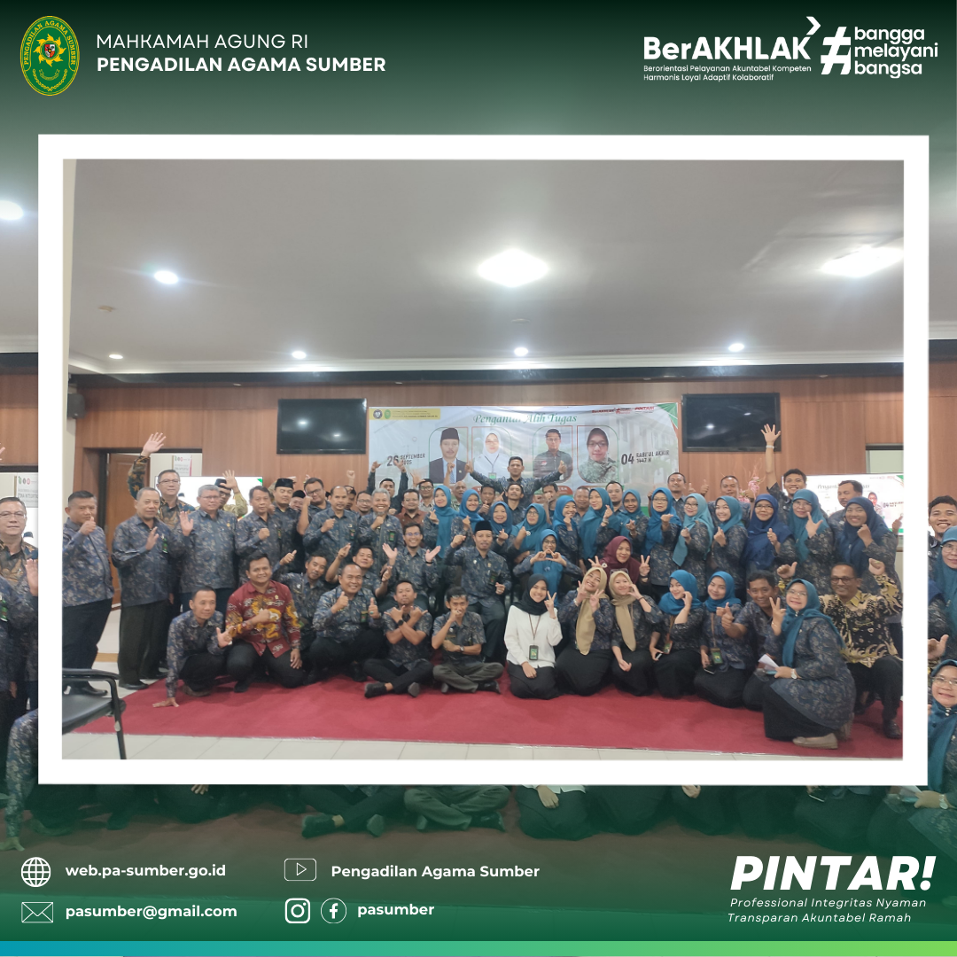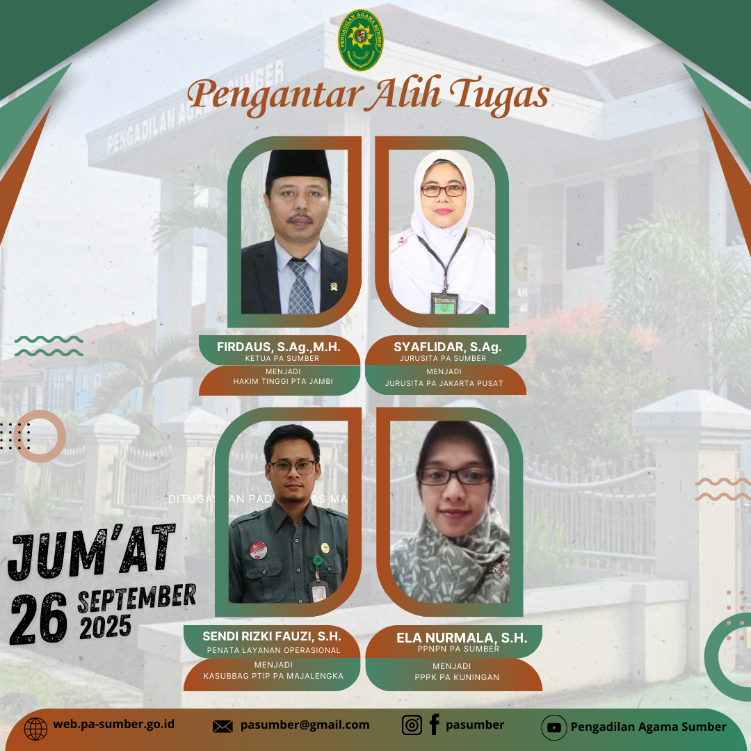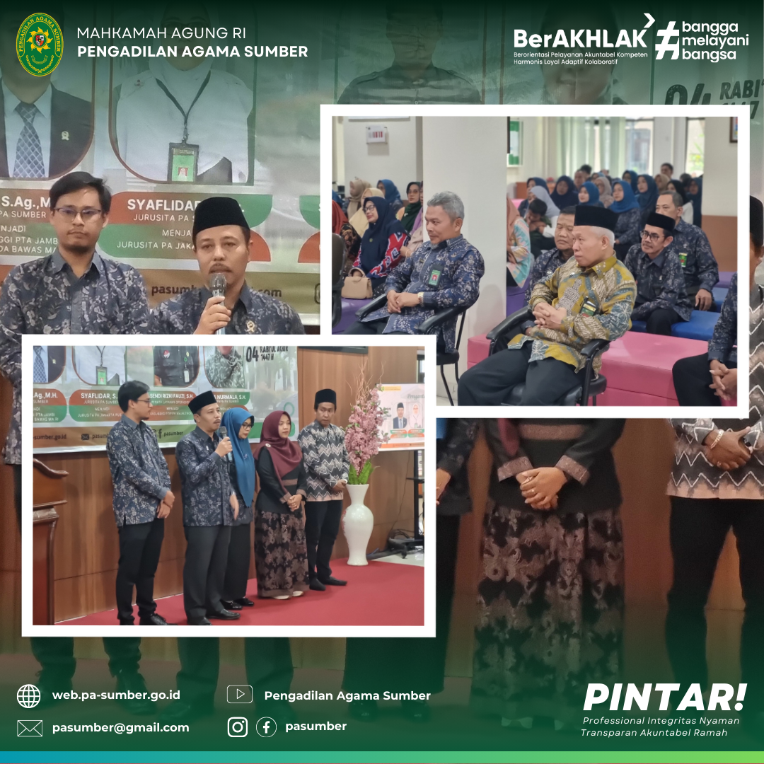 Pimpinan beserta keluarga besar Pengadilan Agama Sumber mengucapkan terimaksih atas selaga dedikasinya selama bertugas di Pengadilan Agama Sumber, semoga lebih sukses lagi ditempat yang baru.