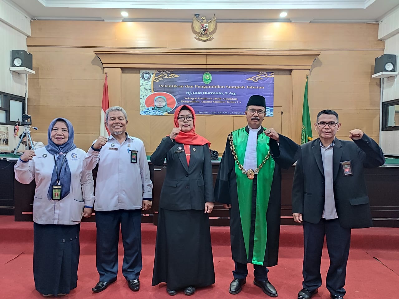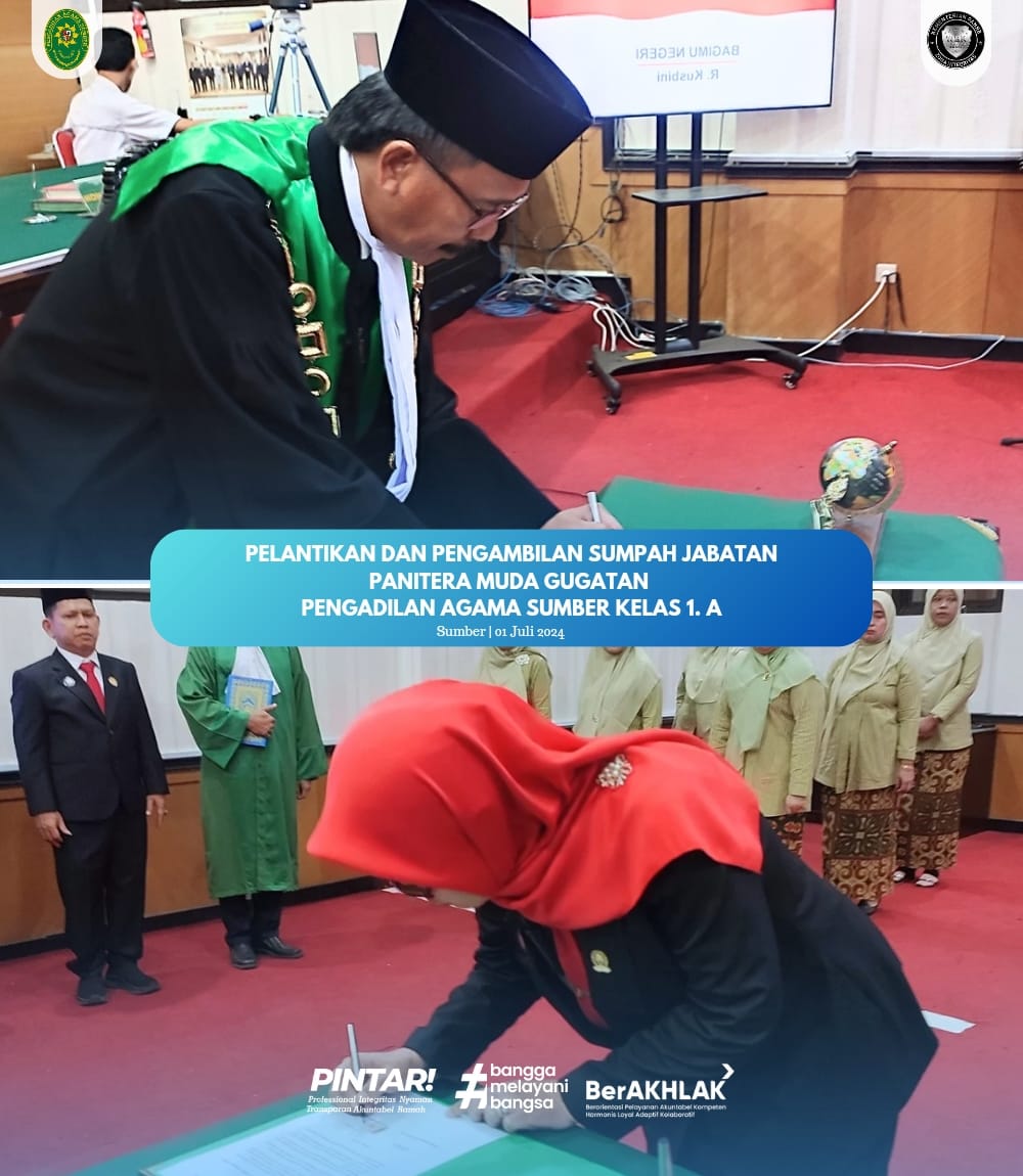 Sumber – Pada Senin, 01 Juli 2024, Ketua Pengadilan Agama Sumber melantik Hj. Lela Nurmala sebagai Panitera Muda Gugatan PA Sumber. Hal ini sesuai berdasarkan Keputusan Direktur Jenderal Badan Peradilan Agama MARI Nomor : 355/DJA/SK.KP4.1.3/VI/2024 tanggal 11 Juni 2024. Acara tersebut diawali dengan Pembacaan Surat Keputusan, kemudian diakhir dengan penandatangan Pakta Integritas, sebagai pernyataan dan tanggung jawab Pejabat yang baru untuk bekerja semaksimal mungkin serta komitmen untuk tidak melakukan praktek korupsi, kolusi dan nepotisme.